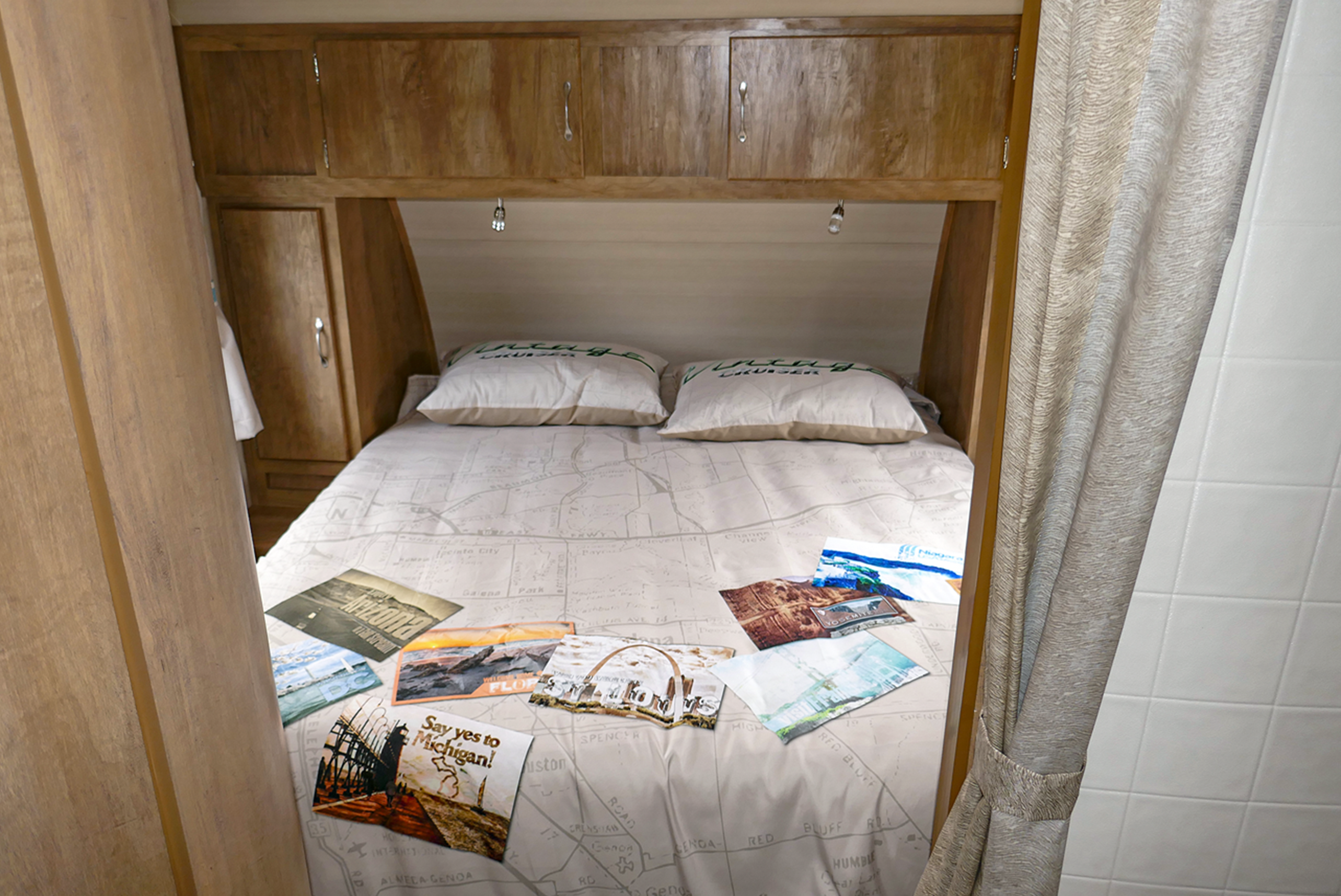 La roulotte Vintage 1 est une roulotte Vintage (marque) qui loge 2 adultes. À l'entrée, le lit queen size est à droite. La roulotte contient aussi un coin-repas et une cuisine avec une cuisinière de 3 brûleurs, micro-onde, un petit double évier, et un réfrigérateur-congélateur. Elle a aussi une petite salle de bain avec une toilette, une douche, et un lavabo. Amusez-vous en écoutant de la musique dedans et aux auvents dehors avec le système audio qui prend les CDs, Bluetooth, AUX, et carte SD. Cette roulotte inclut une télévision avec la connexion de l’antenne. L'extérieur a des auvents rétractables avec des lumières, haut-parleurs, terrasse en bois, foyer extérieur, table de pique-nique, et gril à charbon.