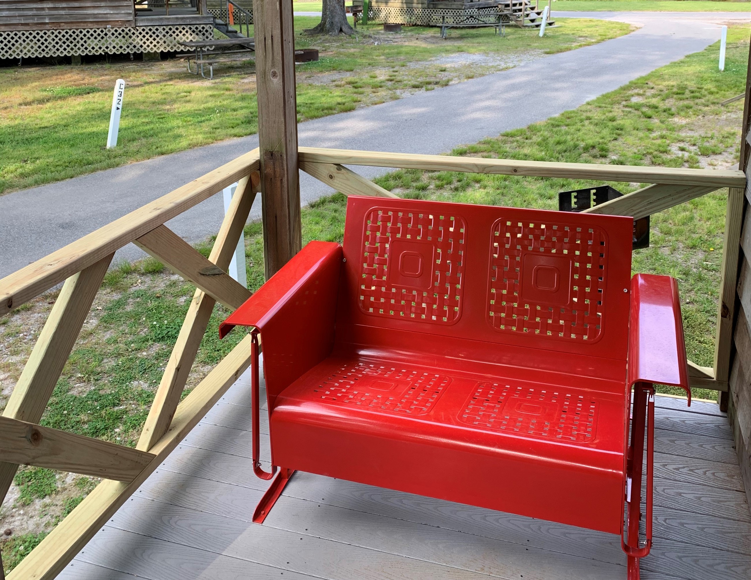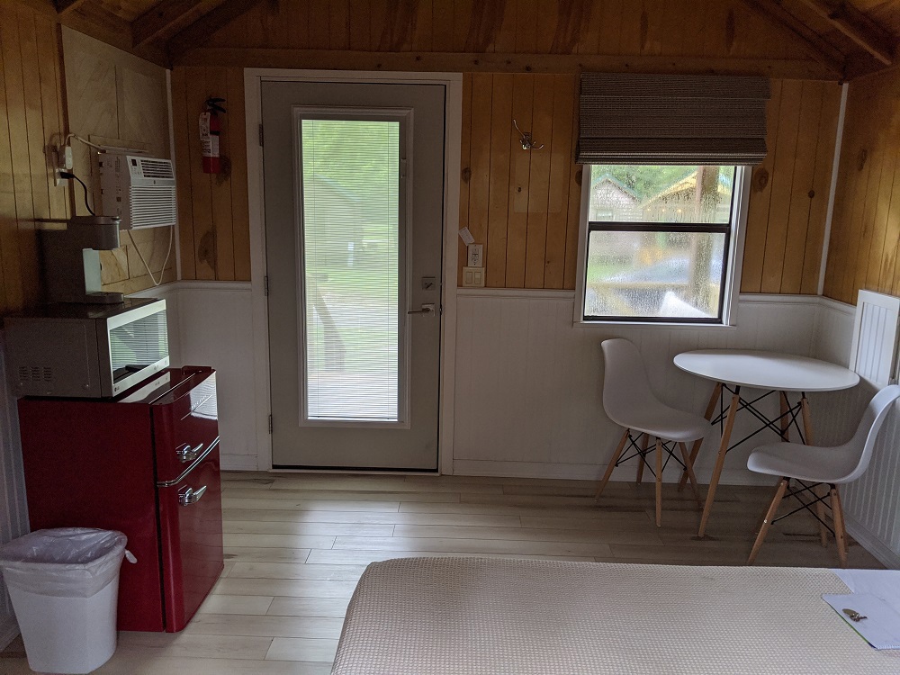 For guests looking to camp with more of the comforts of home, our temperature-controlled Studio Cabins have a queen bed with linens and pillows included. The cabins contain a dining table and chairs for two, bedside tables, a miniature fridge and freezer, a Keurig coffee maker, and a microwave. On the porch outside, you’ll find a retro glider for two, along with a barbecue grill, picnic table, and fire pit. The studio cabins are located close to our comfort stations for you to use. Smoking or pets are not permitted.