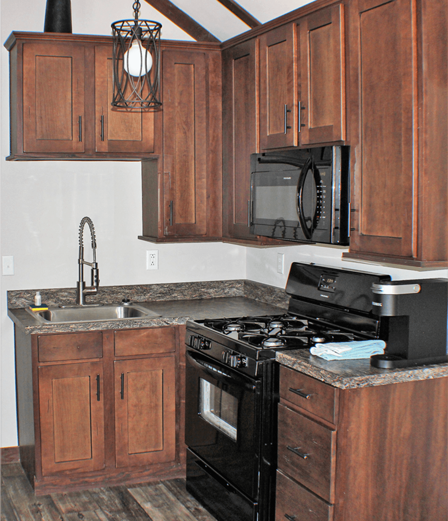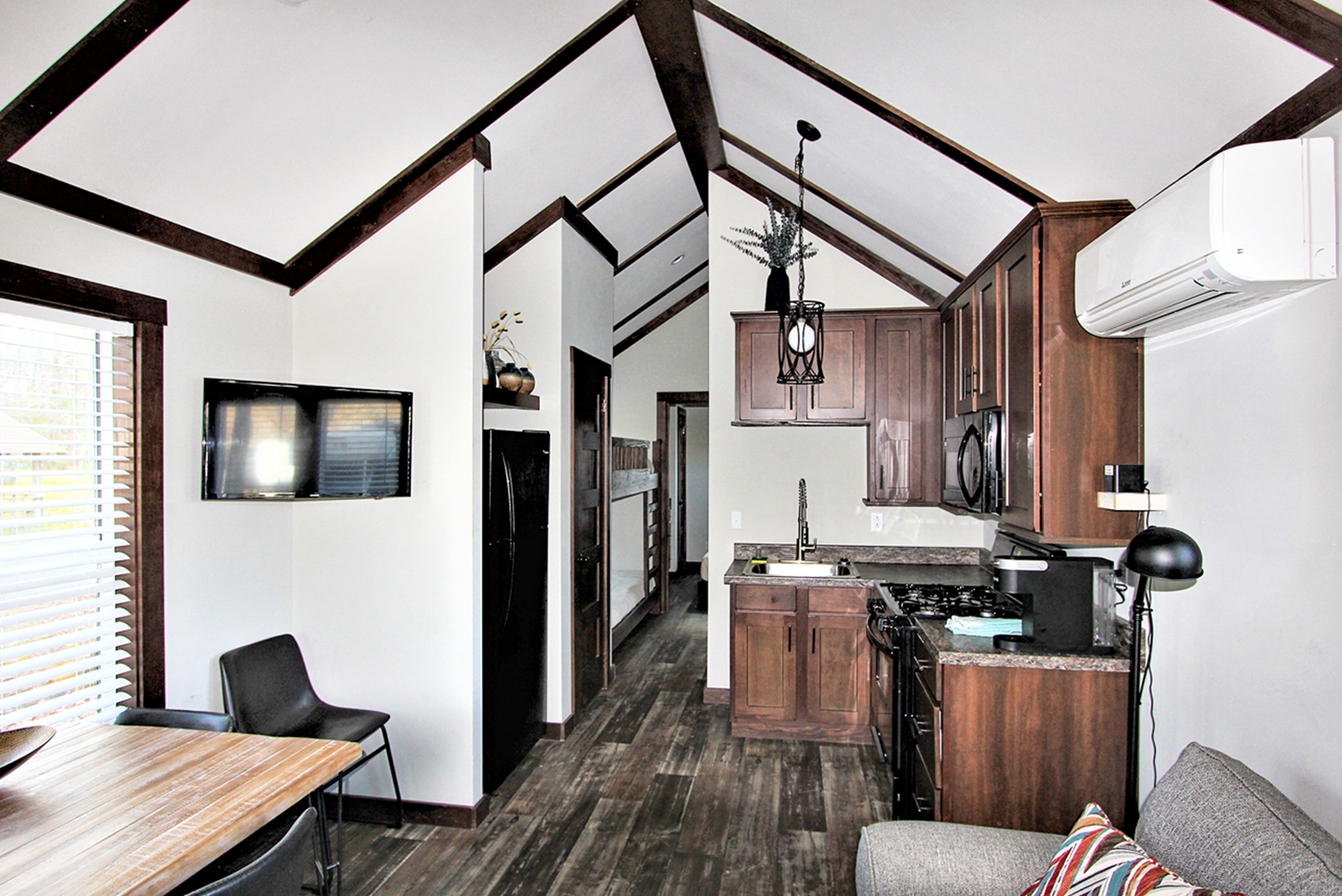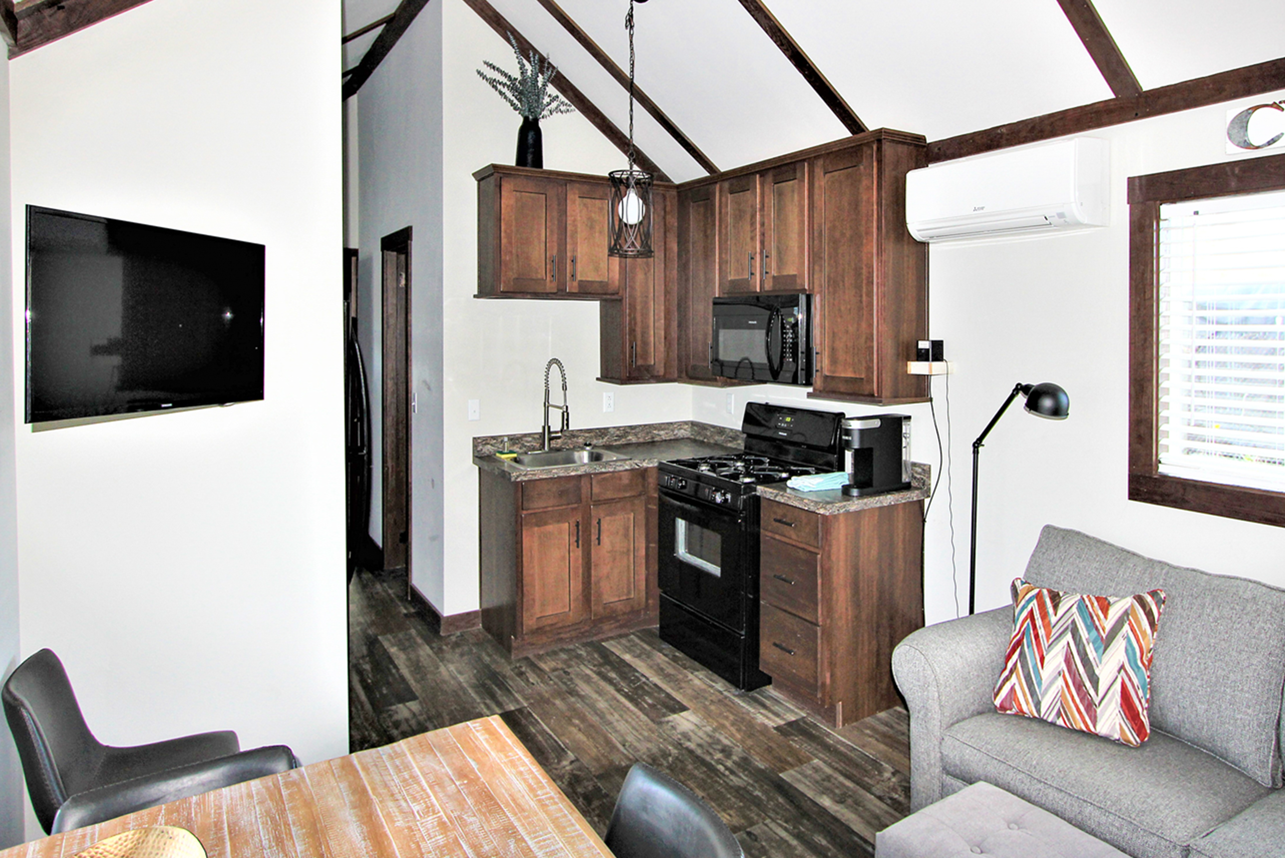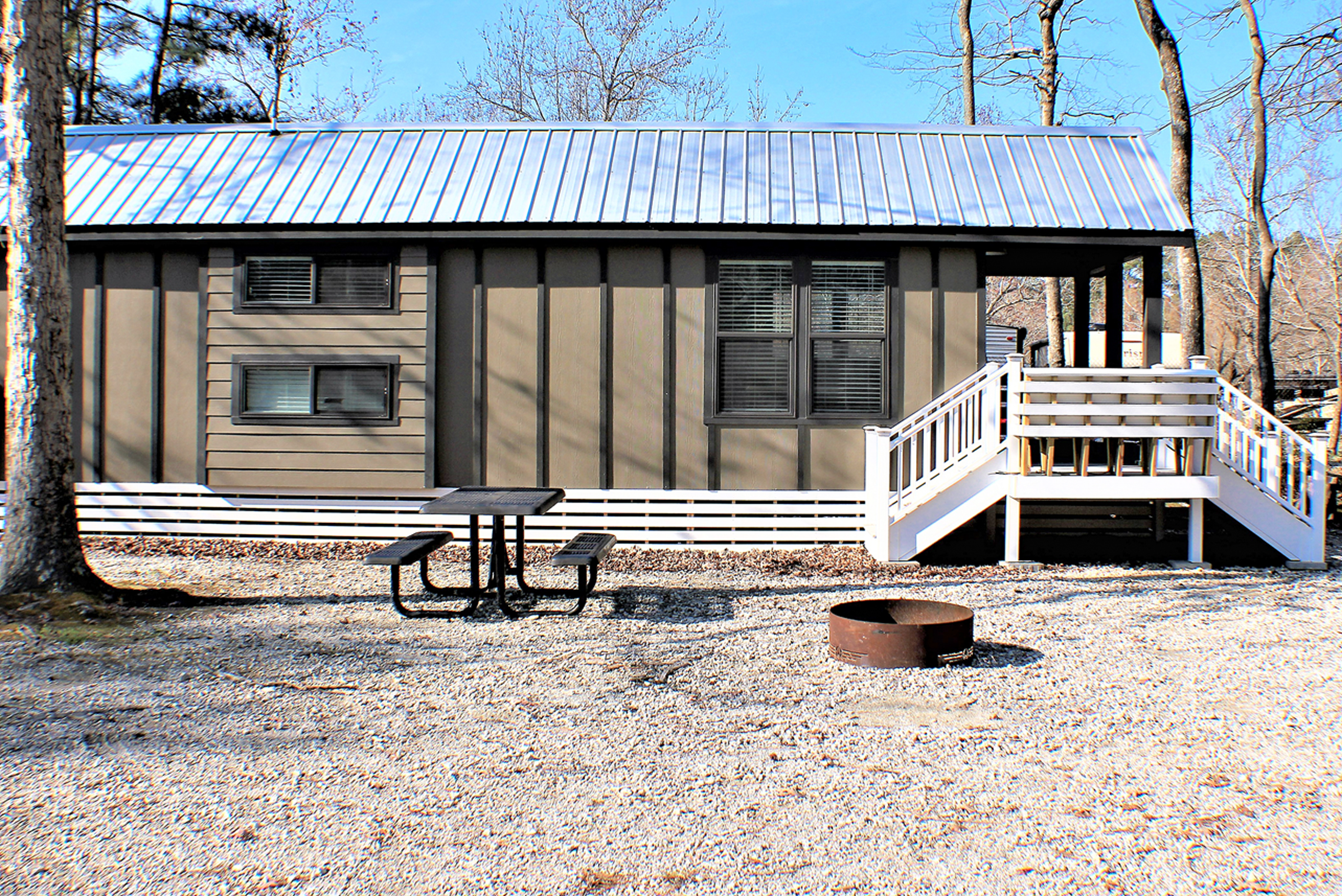 Cottage 1165 is a full service cottage in the Beechtree Forest Section of our campground. The cottage has vaulted ceilings throughout. The kitchen is equipped with everything you need to cook and store your food. There is a dining table with four chairs inside, deck with seating outside and a picnic table. The bathroom has a bath/shower, vanity and toilet. Linens are provided for queen bed, twin beds and bathroom. No smoking. No pets.