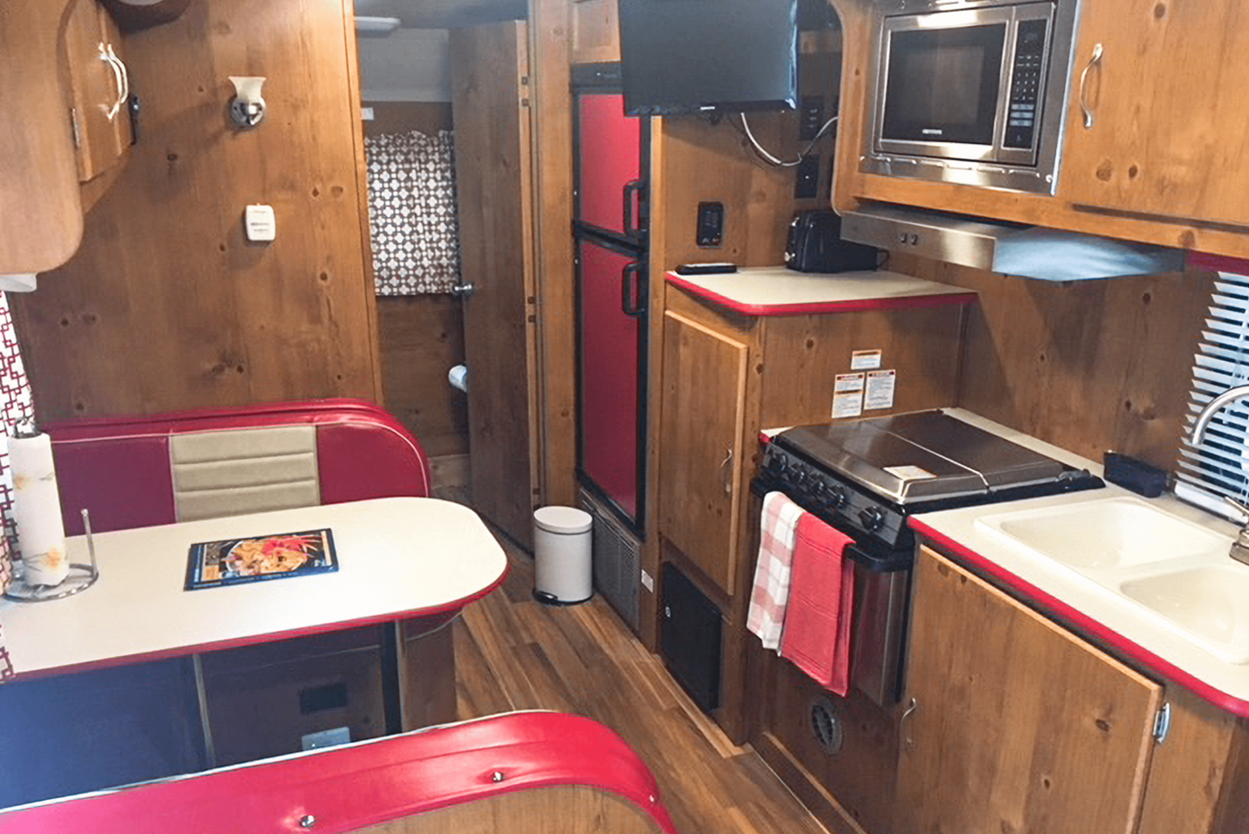 Vintage Trailer 3 is a vintage (trailer type) that sleeps two adults. As you enter, the queen bed is on your right. The trailer also features a dinette and a kitchen with 3 burner stove, microwave, a small double sink and a refrigerator/freezer. It also has a full bathroom with toilet, shower and sink. Enjoy the stereo radio/CD play with Bluetooth, AUX and SD Card inputs; connects to speakers inside and on outdoor awnings. This trailer features a TV with antenna reception. Exterior has retractable awning with outdoor lights, speakers, deck, fire pit, picnic table and charcoal grill.